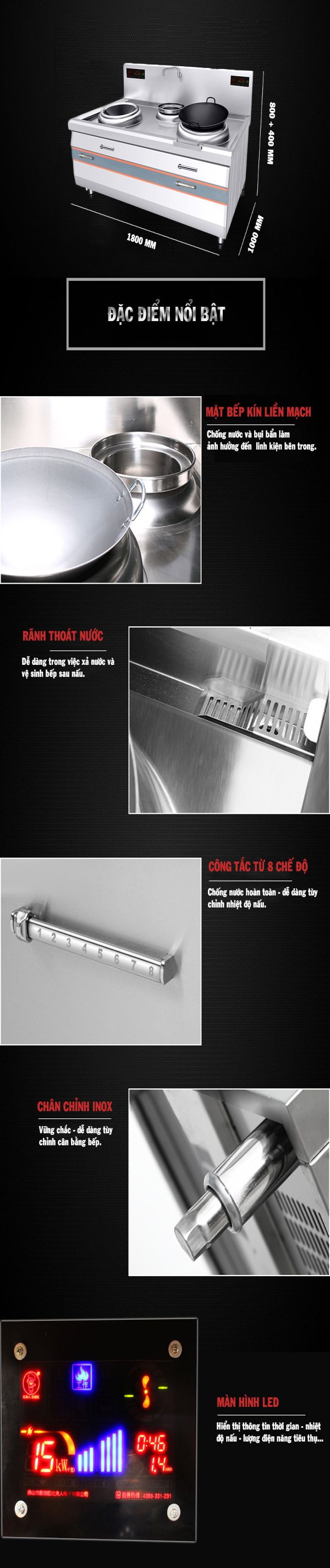 Bếp từ công nghiệp đôi mặt lõm được sử dụng trong các nhà hàng, khách sạn cao cấp với ưu điểm là: nấu đáp ứng nhanh, sạch sẽ, không khói bụi, tiếng ồn và tiết kiệm hơn so với các loại bếp nấu truyền thống.