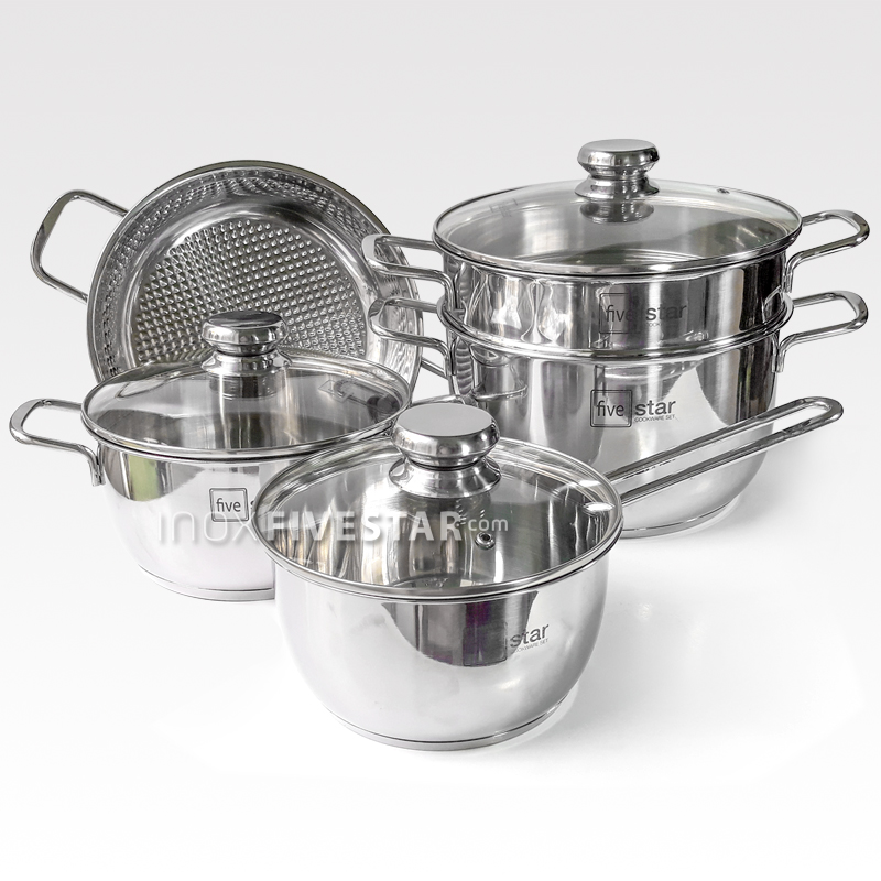 1 quánh 18cm, 1 nồi 20cm, 1 nồi 24cm, 1 lồng xửng 24cm, 1 chảo caro 24cm