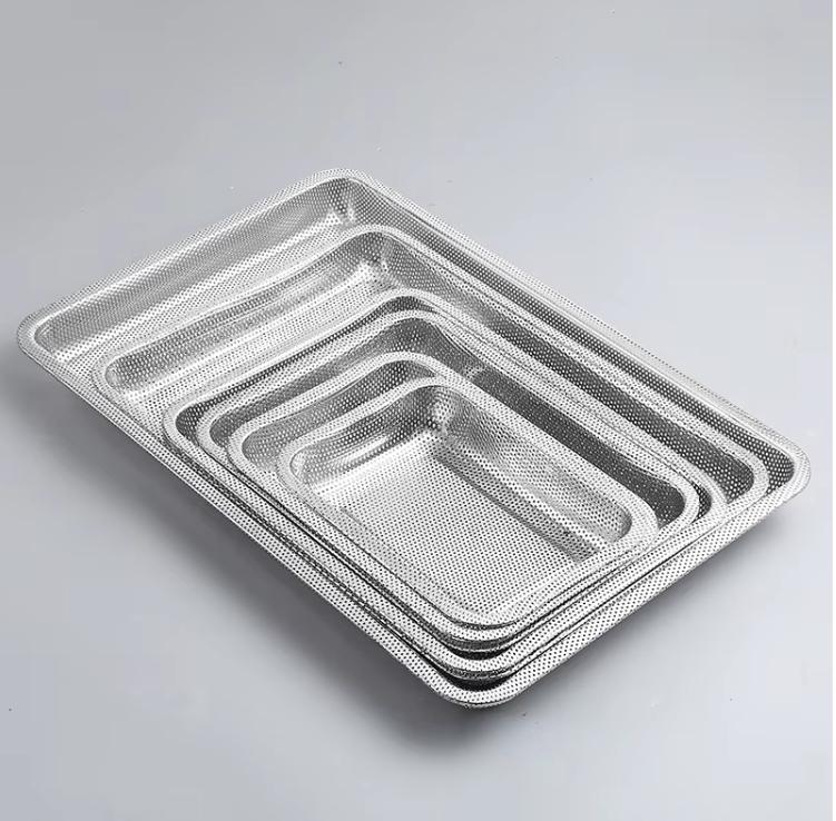 Khay đục siêu lỗ nhiều kích thước inox 201, 304 thường được dùng nhiều trong bếp ăn công nghiệp, trường học, nhà hàng. Sản phẩm dùng để đựng rau củ quả sau khi luộc, các món chiên rán hay nướng, hoặc dùng để làm khay hấp đồ ăn trong các tủ sấy hấp công nghiệp...