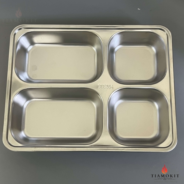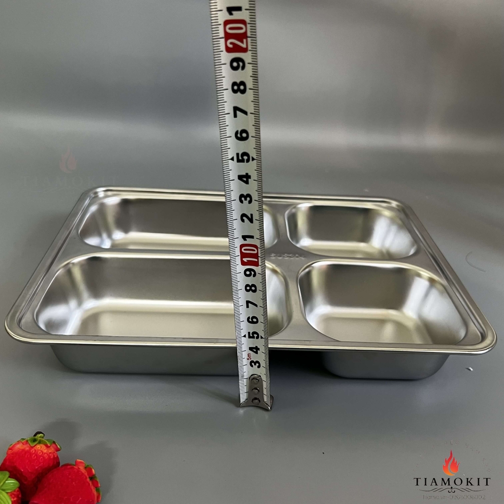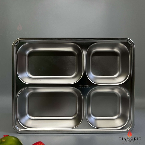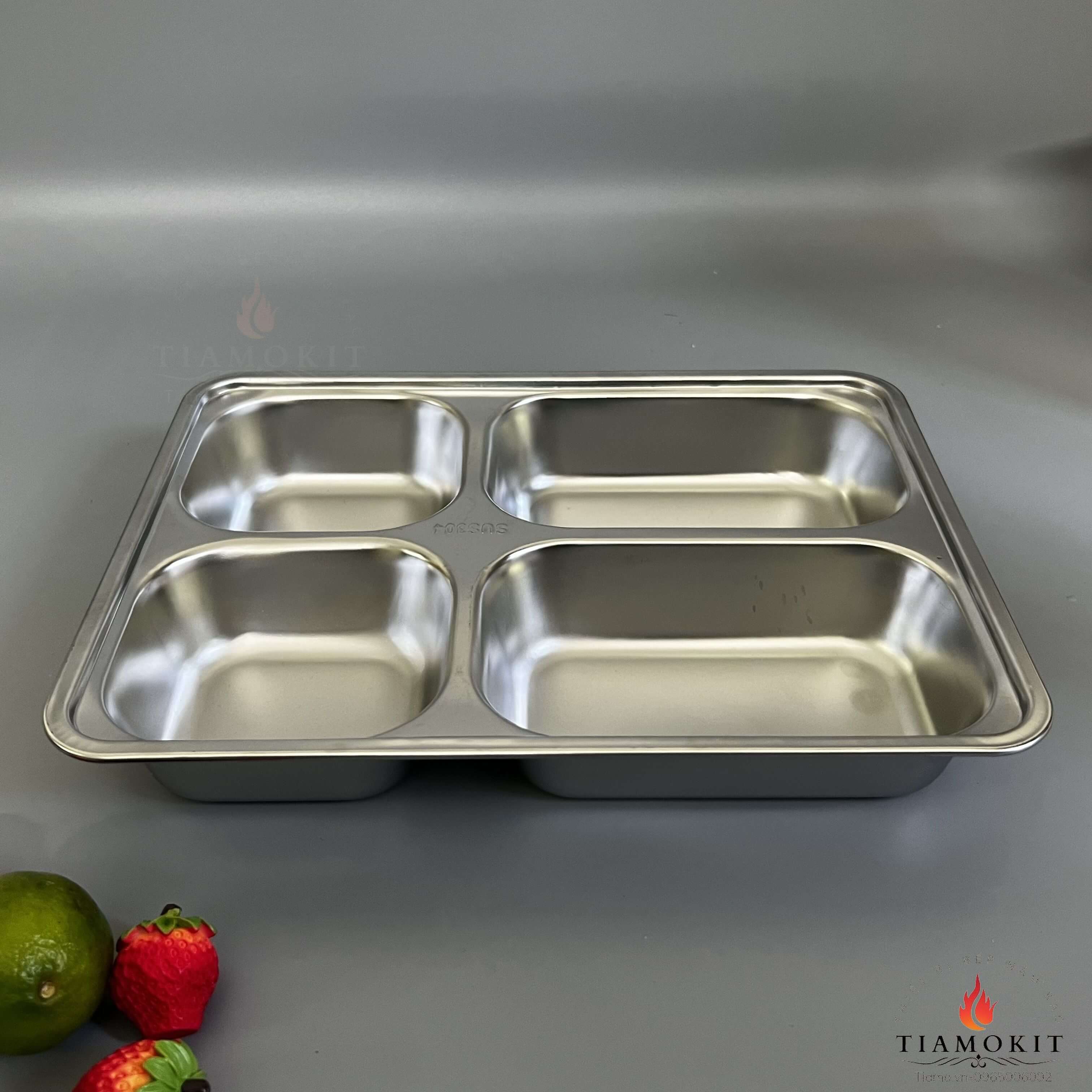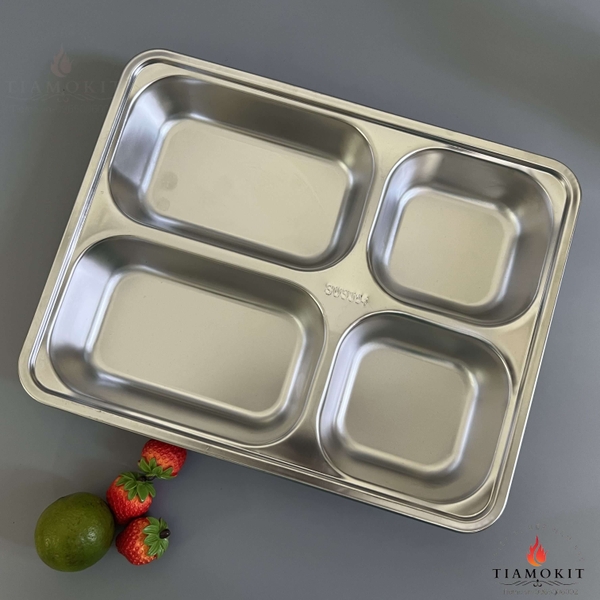 - khay inox 4 ngăn sâu lòng sus304 đựng cơm có thiết kế với 4 ngăn. Trong đó, 2 ngăn to, 2 ngăn nhỏ đựng cơm, đựng rau và thức ăn, nước chấm...