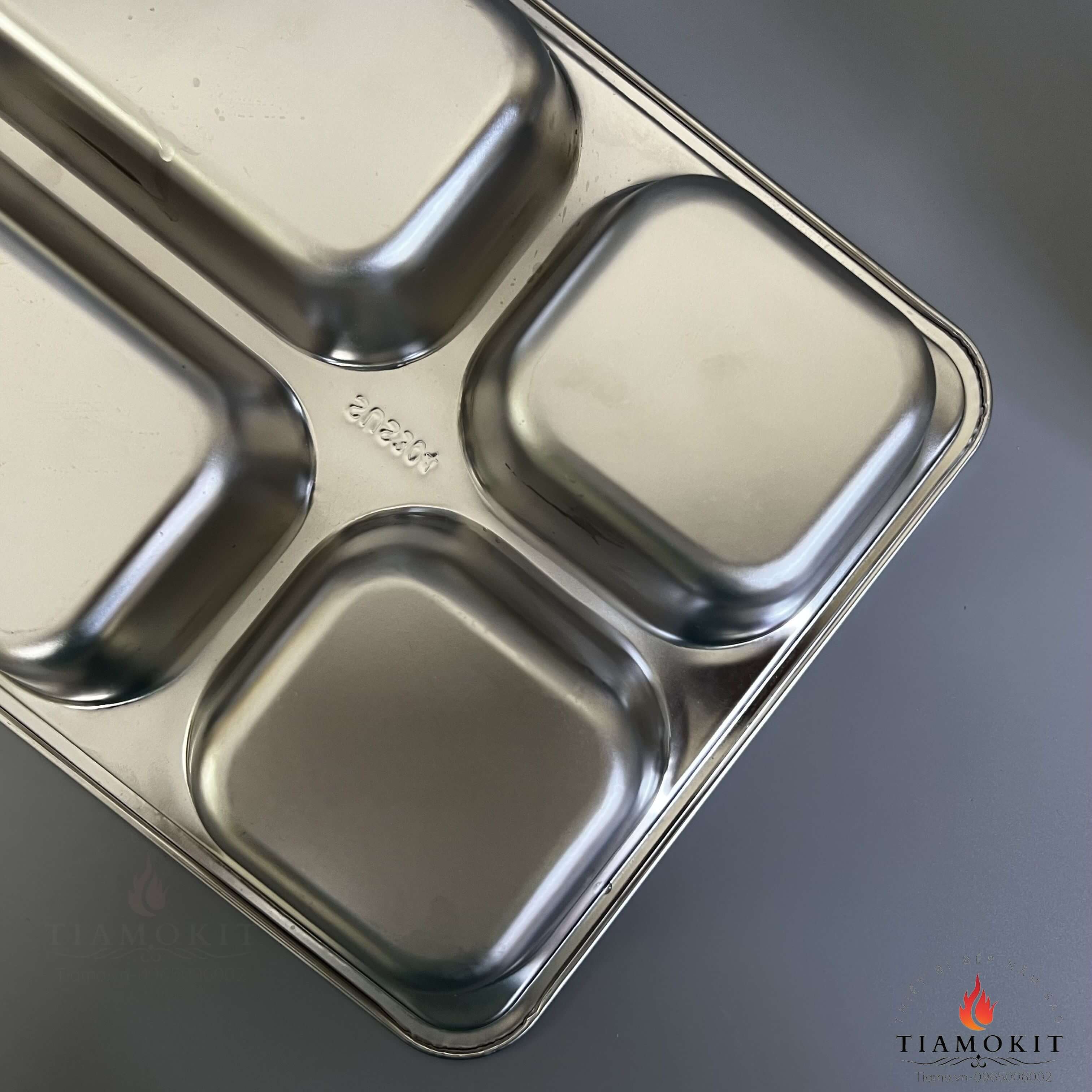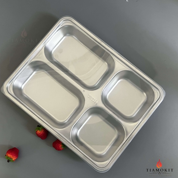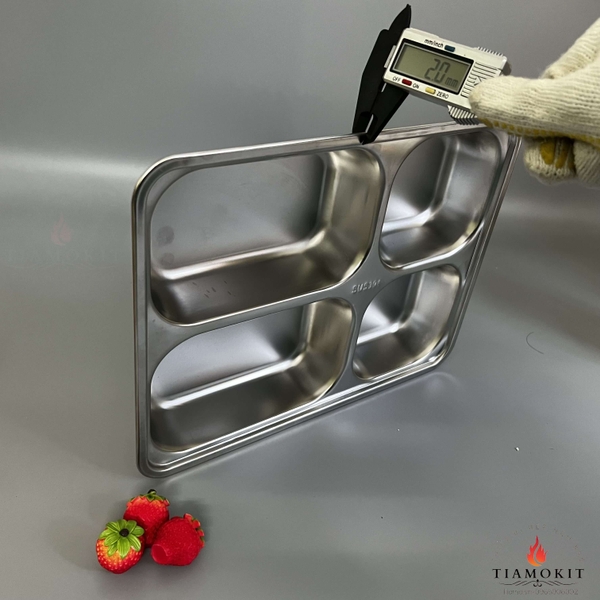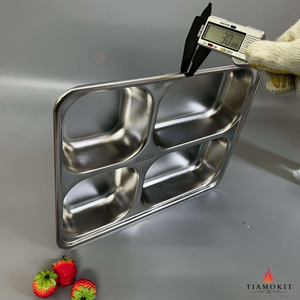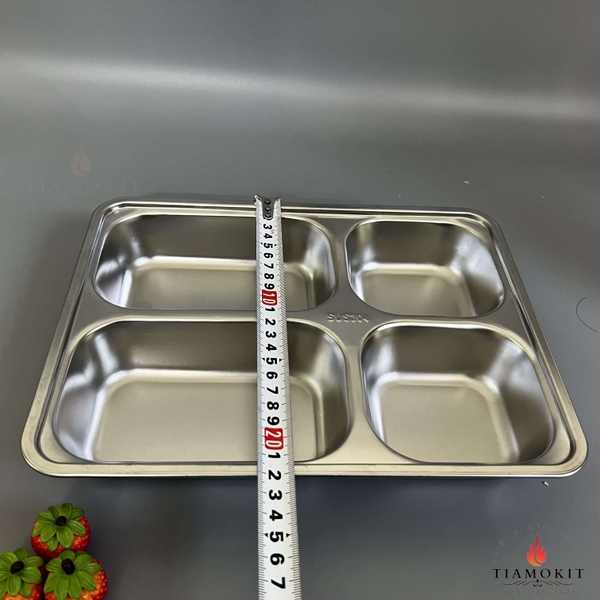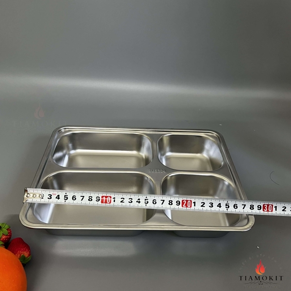 - khay inox 4 ngăn sâu lòng sus304 đựng cơm có thiết kế với 4 ngăn. Trong đó, 2 ngăn to, 2 ngăn nhỏ đựng cơm, đựng rau và thức ăn, nước chấm...