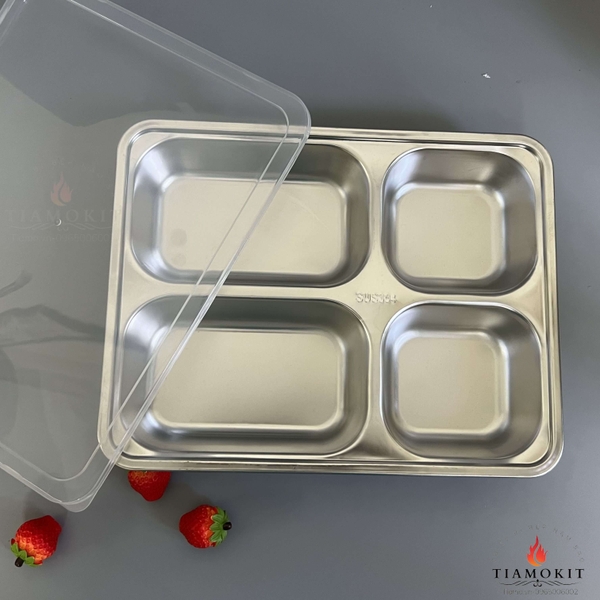 Khay inox 4 ngăn sâu lòng sus304 cao cấp, bền đẹp, không từ tính. Đảm bảo an toàn vệ sinh thực phẩm. Khay có thiết kế nhỏ, rộng đáp ứng được khẩu phần ăn công nghiệp, mép khay gia công mềm mại có nắp đậy. Khay inox có nắp khít; nắp nhựa được thiết kế khít chặt vào khay, khi di chuyển đậy nắp không bị bung thức ăn ra ngoài; nắp inox bền bỉ, sang trọng. Với thiết kế sang trọng và đầy tinh tế, được chia các ngăn nhỏ để cho phần thức ăn được gọn gàng sạch sẽ và đẹp mắt.