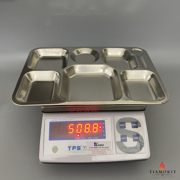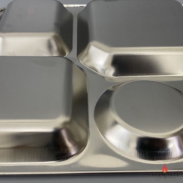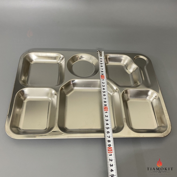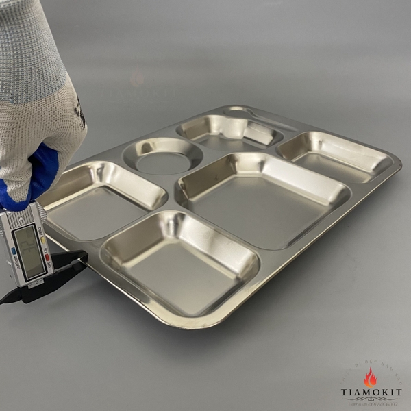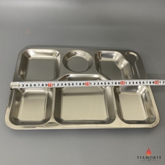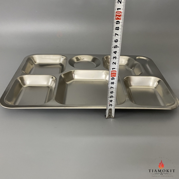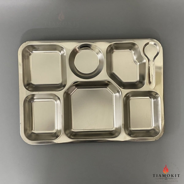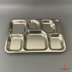 Khay inox 7 ngăn có thiết kế kích thước khổ lớn, sâu lòng, phù hợp cho khẩu phần ăn lớn, được sử dụng rộng rãi trong các khu công nghiệp, trường học, bệnh viện,... Thiết kế hình chữ nhật góc cạnh khỏe khắn, khay chia thành 5 ô đựng thức ăn, 1 ô đựng thìa và 1 ô phụ đựng gia vị, tăm…