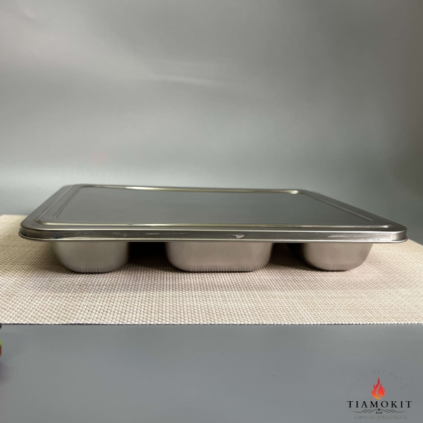 - Khách hàng có thể tùy chọn một trong hai chất liệu nắp khay là: nắp đậy bằng inox hoặc nắp đậy bằng nhựa được thiết kế vừa vặn với khay, khi di chuyển đậy nắp không bị bung thức ăn ra ngoài.
