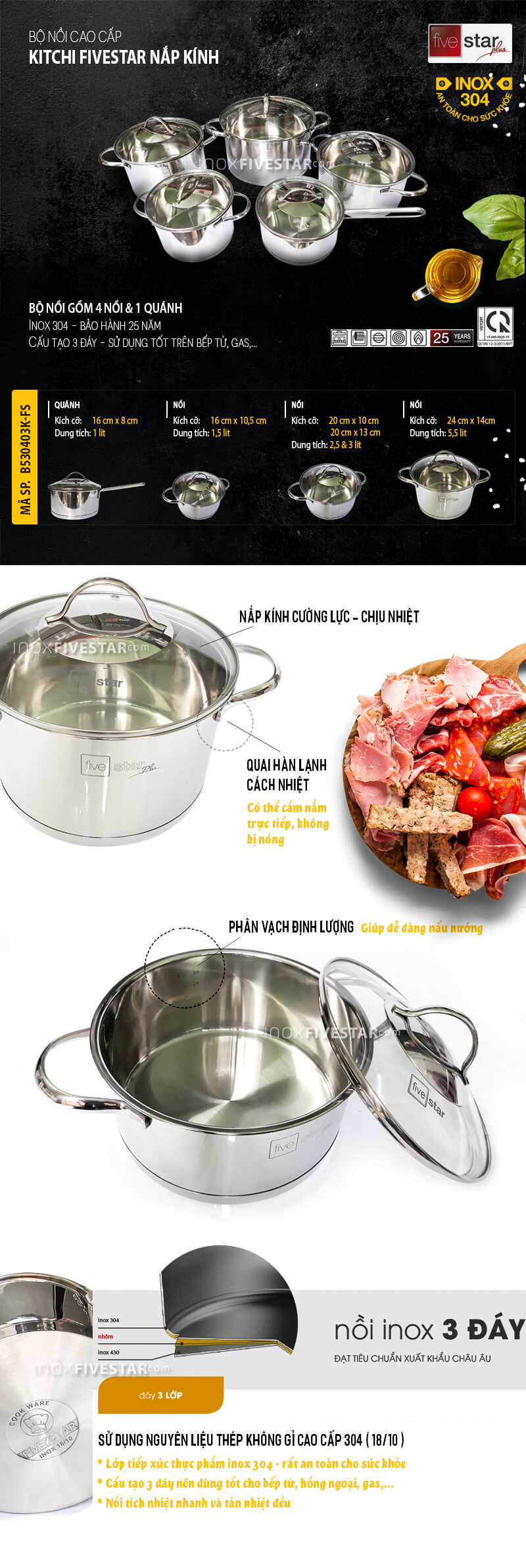 Bộ Nồi Inox 5 Đáy Fivestar Nắp Kính: