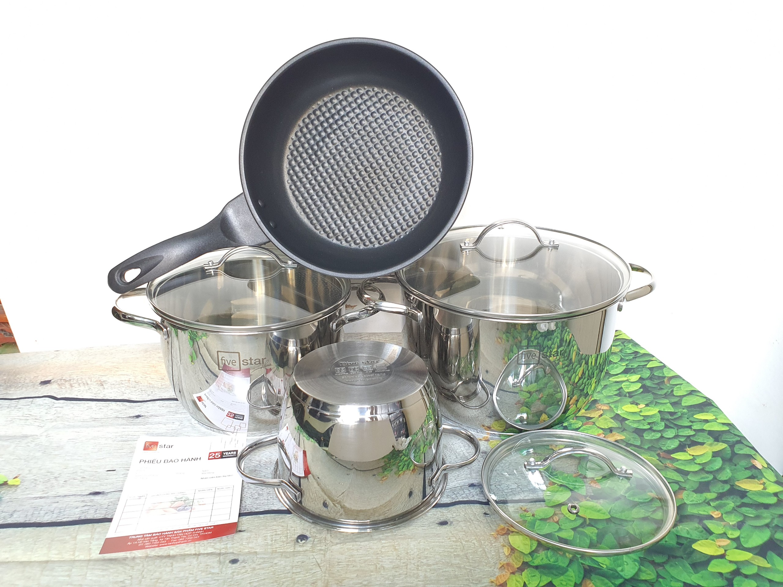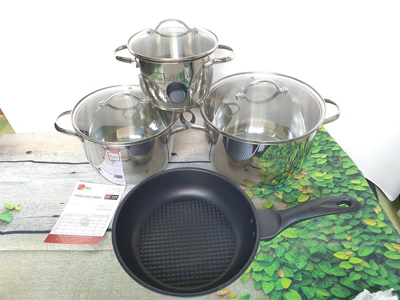 1 nồi 16cm, 1 nồi 20cm, 1 nồi 24cm, 1 chảo 24 cm (inox 430)