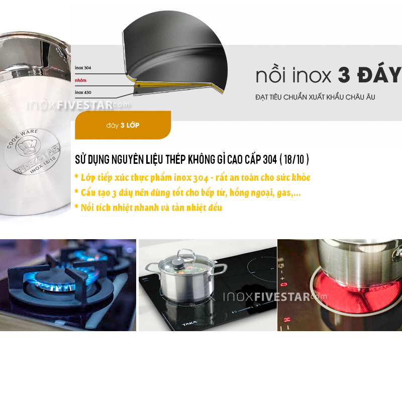 Thiết kế 3 đáy của bộ sản phẩm Nồi inox Fivestar inox 304 còn giúp bạn tiết kiệm ga hay điện khi nấu nướng. Thật đơn giản và tiện dụng, chỉ với một sự lựa chọn công việc nấu ăn của bạn sẽ dễ dàng hơn bao giờ hết.