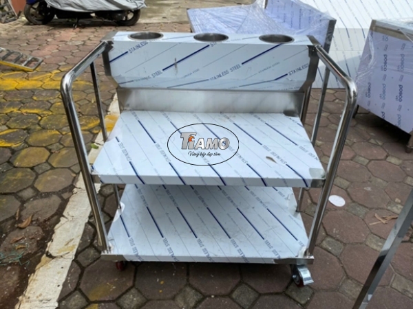 - Thiết kế linh động: Xe có 3 hốc chứa thìa và đũa cùng với 2 tầng để khay có thể chứa lượng lớn khay, thìa, đũa di chuyển tiện lợi.